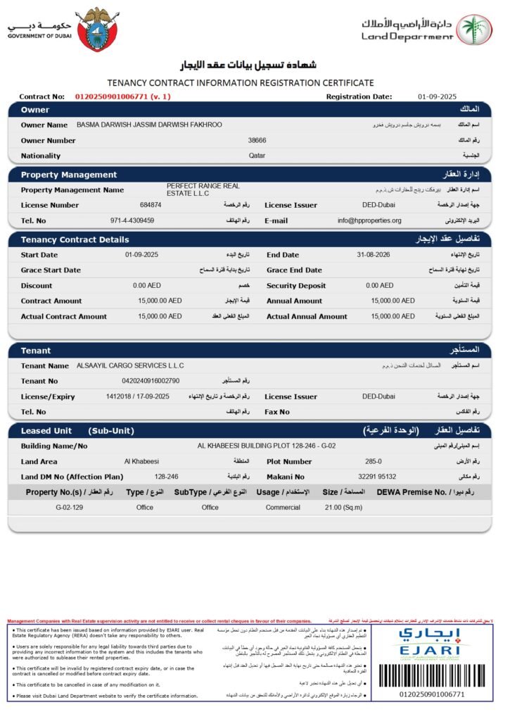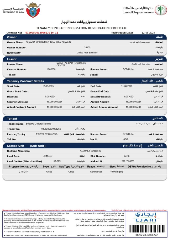 Our business operates from a legally registered commercial space in Dubai, supported by an official Ejari tenancy contract issued by the Dubai Land Department. This ensures full compliance, transparency, and reliability in all our operations, providing clients with confidence and trust in our physical presence and business legitimacy.