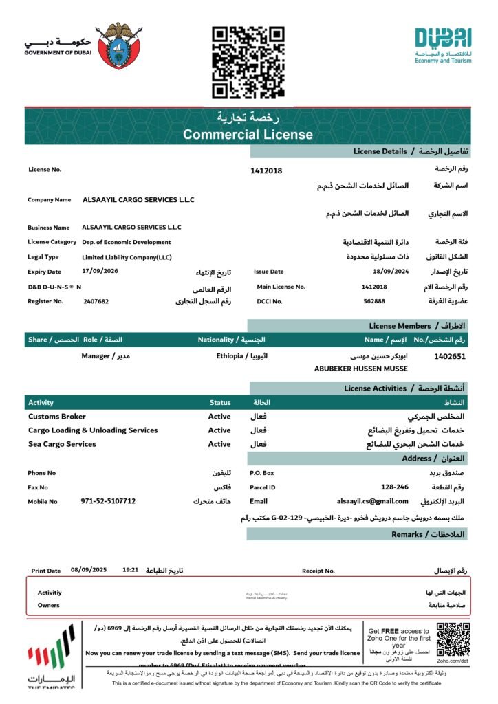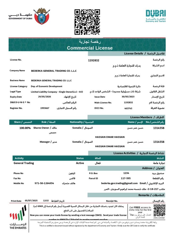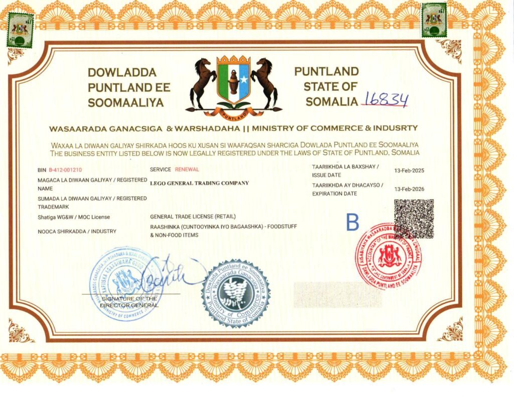 Our company is officially registered under the Ministry of Commerce and Industry in Puntland, Somalia. We operate with a verified General Trade License, legally authorized to engage in retail trading, foodstuff distribution, and non‑food item commerce. This certification reflects our commitment to operating with full transparency, compliance, and trust across all business activities.