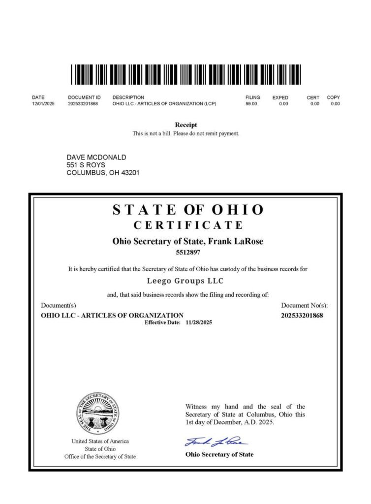 Leego Groups LLC is an officially registered business in the State of Ohio, certified by the Ohio Secretary of State. Our company operates in full compliance with state regulations, maintaining verified Articles of Organization and legally documented business status to ensure trust, transparency, and credibility in every service we provide.
